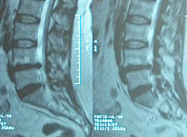 MRI done 21-06-2004, as seen in the inferior row, showed a massive recurrence, even with intradural migration of the annulus fibrosis. Due to relatively minor complains of the patient, she agreed with hesitation for the second surgery, which was undertaken 04-07-2004. During surgery, some points could be considered: 1.Usually we transfer the epidural fat to the maximally involved by compression, areas, aided with transferring the subcutaneous fat in pedicle to the epidural space. This fact made dissection for the second surgery more easy and the fibrous tissue was fatty in appearance. 2. The extruded material was a layer from the annulus fibrosis. It was removed very gently and the tail, which was intradural came the last in one piece, after what the CSF start to flow from the dural defect , which was about 2 mm in diameter and stitched accordingly. 3. At the end of operation, another subcutaneous fat was transferred with pedicle to the epidural cavity . Video recording available. The patient was discharged the second postoperative day without complications. Case-2: